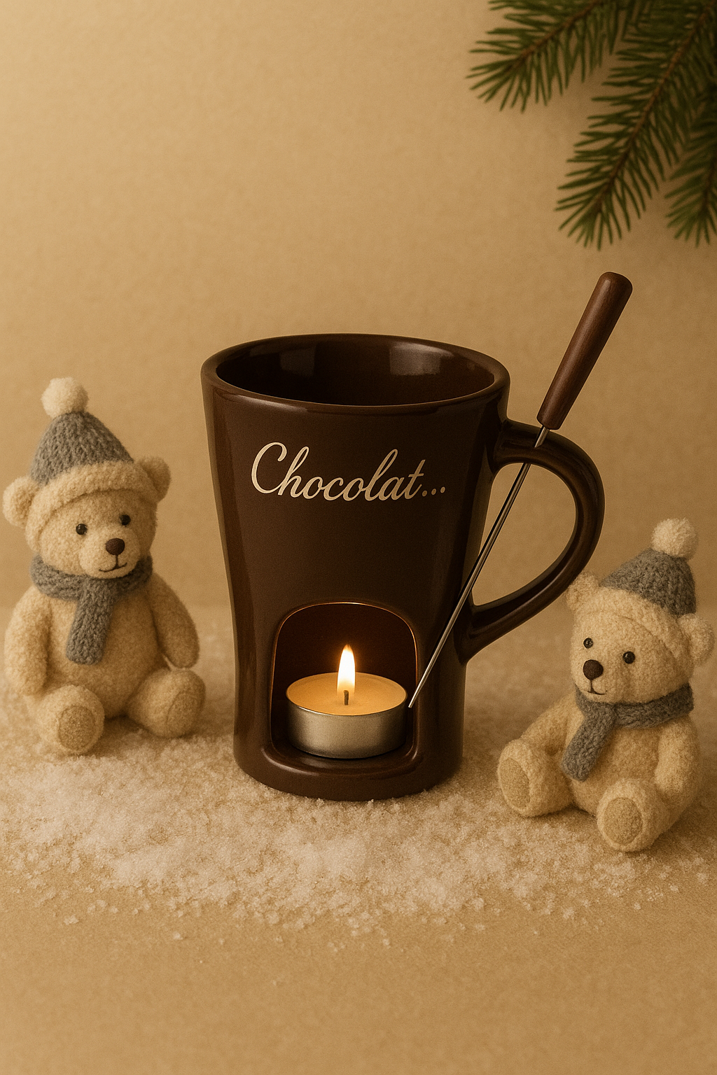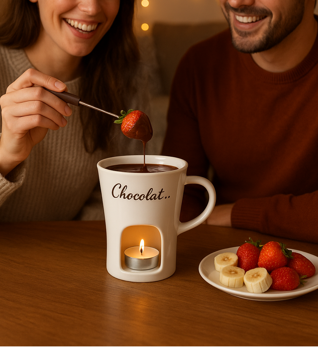 Cana noastră pentru fondue folosește o lumânare mică pentru a topi ciocolata în doar câteva minute.